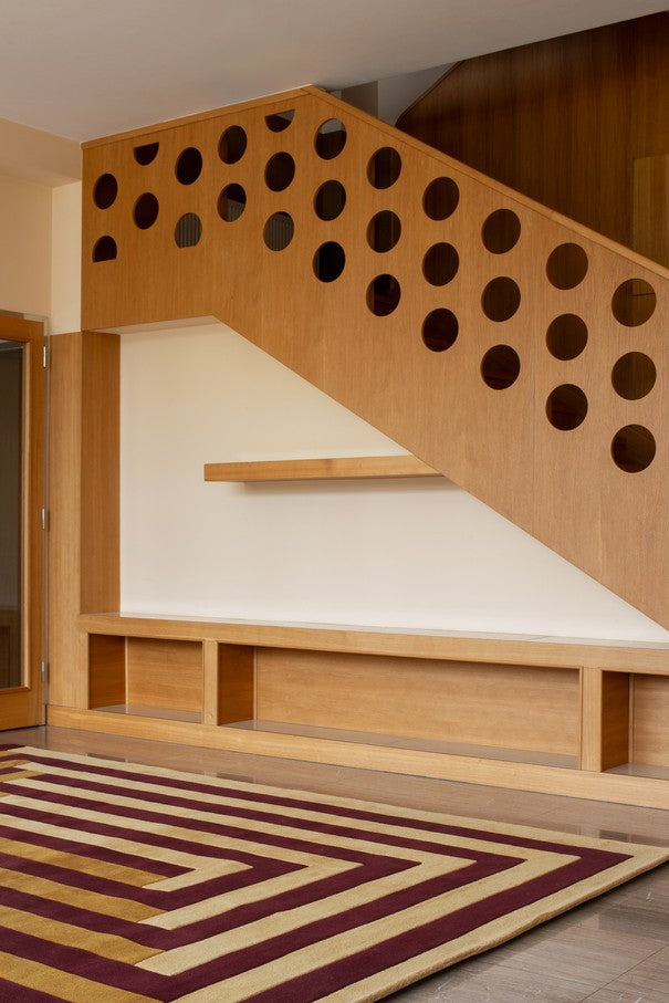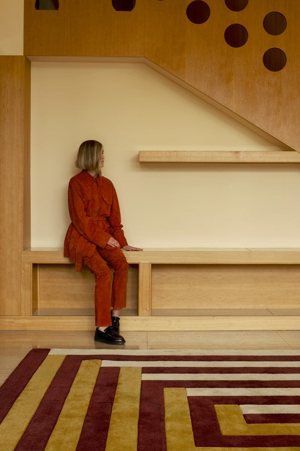 Der Layered Teklan Labyrinth Mulberry Sand verbindet skandinavische Farbkunst mit architektonischem Design. Entworfen von der schwedischen Farbvisionärin Tekla Evelina Severin (Teklan) für Layered, kombiniert dieser moderne Wollteppich sanfte Sandtöne mit tiefem Mulberry-Rot zu einem rhythmischen, grafischen Muster, das Wärme und Struktur in jeden Raum bringt.
