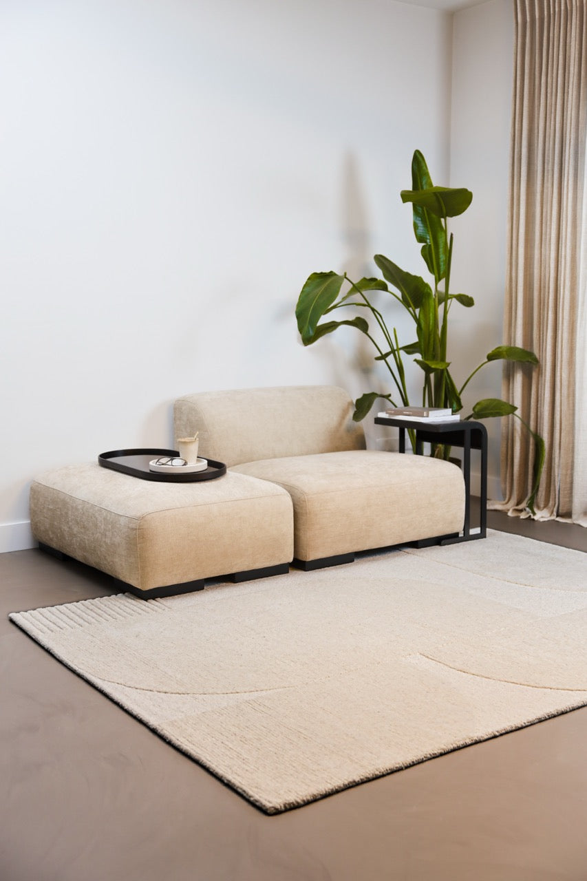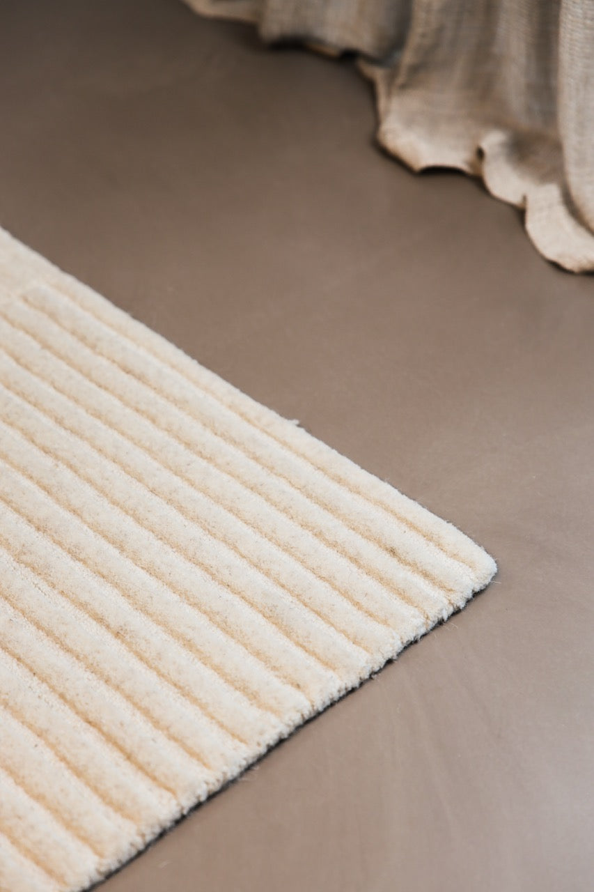Dank der angenehm weichen Wolle fühlt sich der Teppich unter den Füßen besonders komfortabel an. Das ton-in-ton Design spielt subtil mit Licht und Schatten und passt perfekt zu Japandi Interiors, Scandi-Stil und minimalistischen Räumen, die trotzdem Charakter haben dürfen.